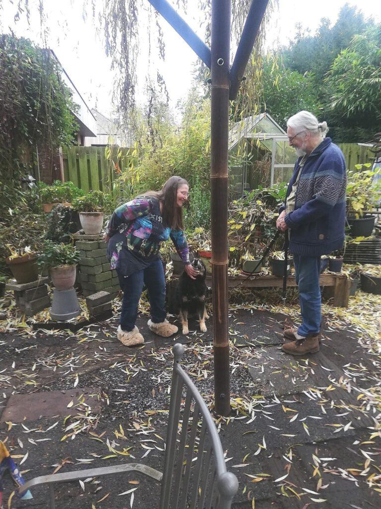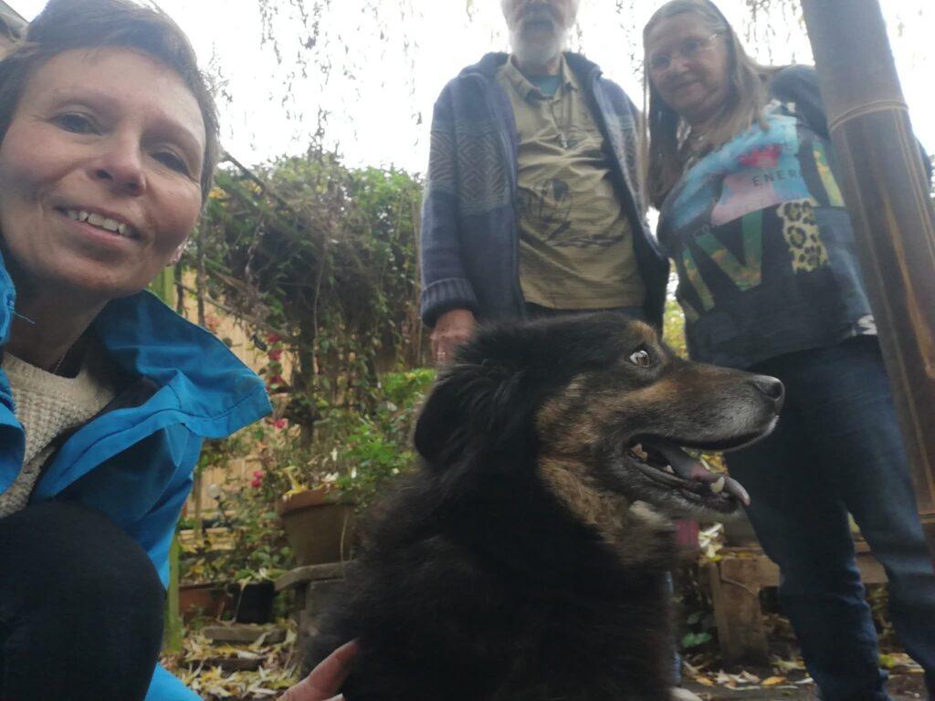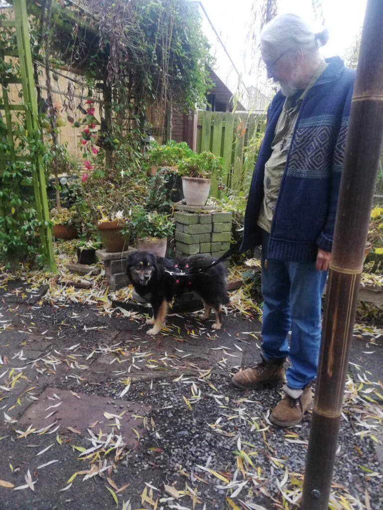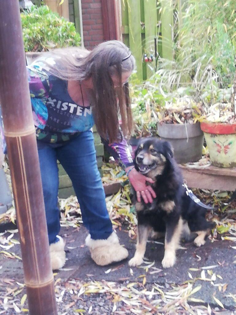 Rock is nog duidelijk onder de indruk van alle nieuwe indrukken en veranderingen. Daarom gaat alles in kleine, voorzichtige stapjes. Voorlopig blijft hij alleen aangelijnd in de tuin, zodat hij rustig kan wennen aan zijn nieuwe omgeving. Verder krijgt hij vooral veel rust, liefde en geduld — precies wat hij nodig heeft.